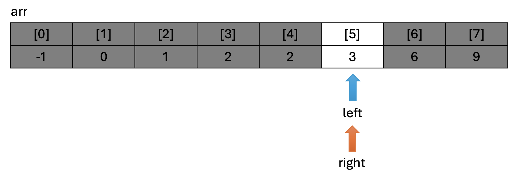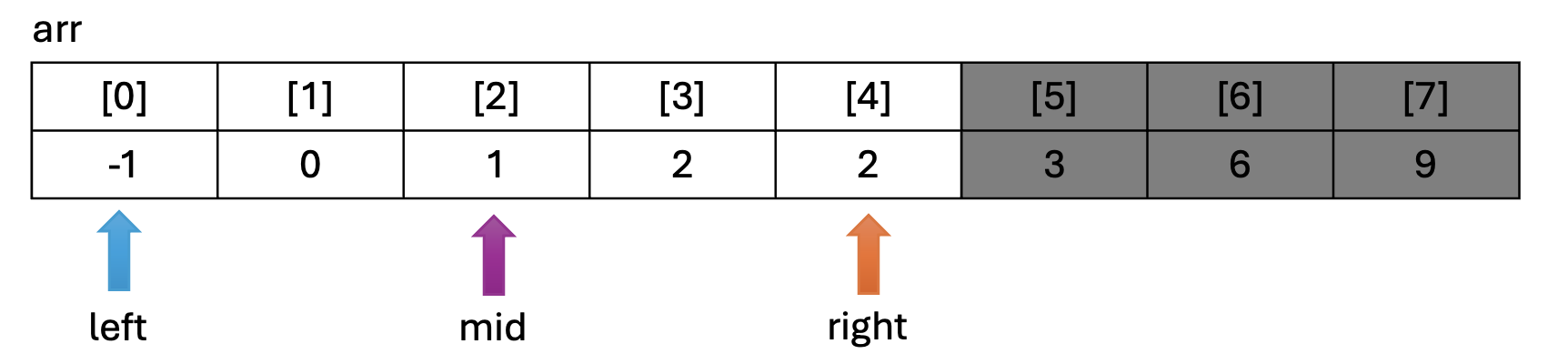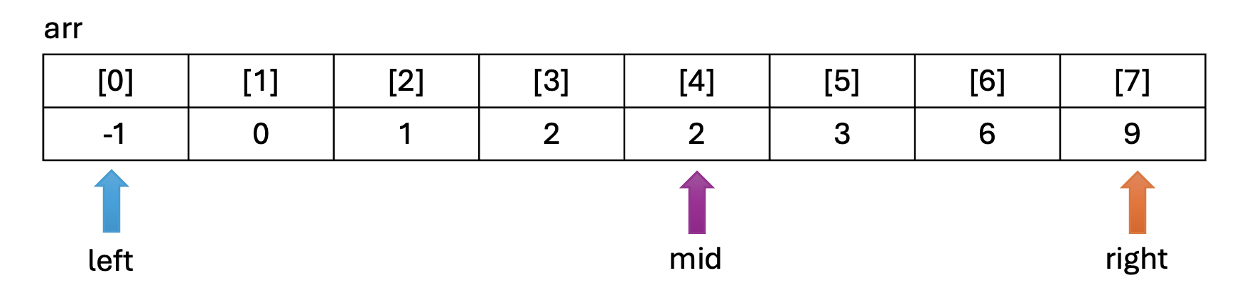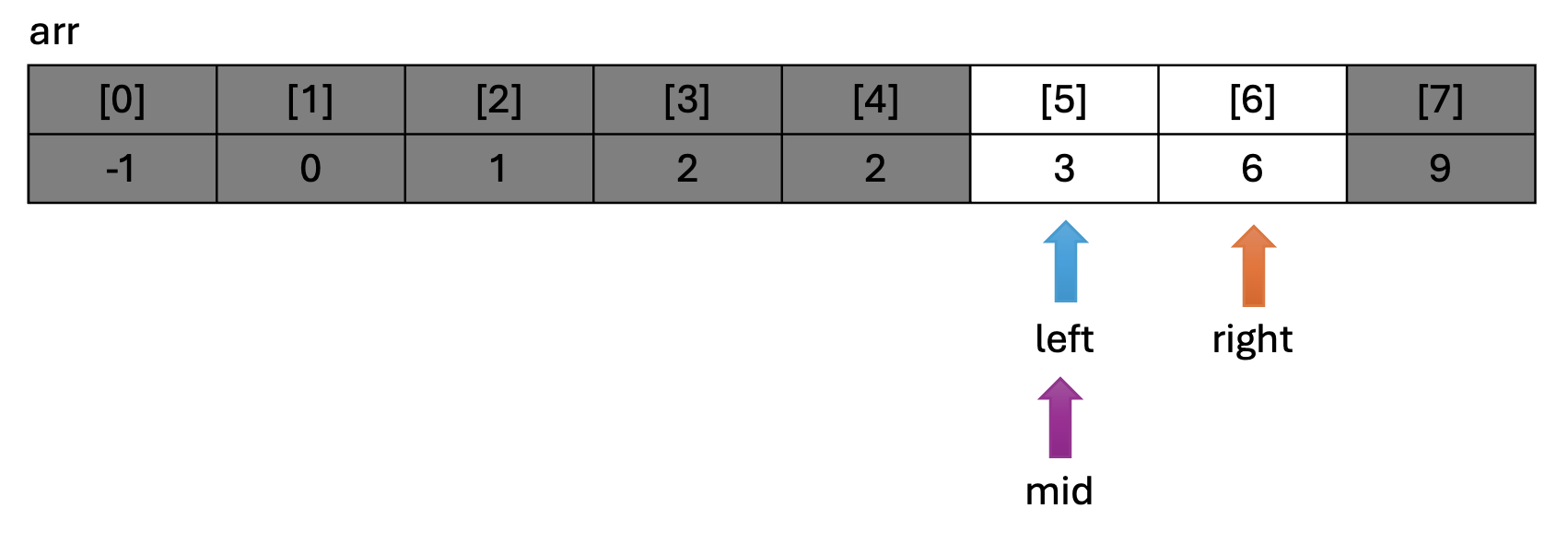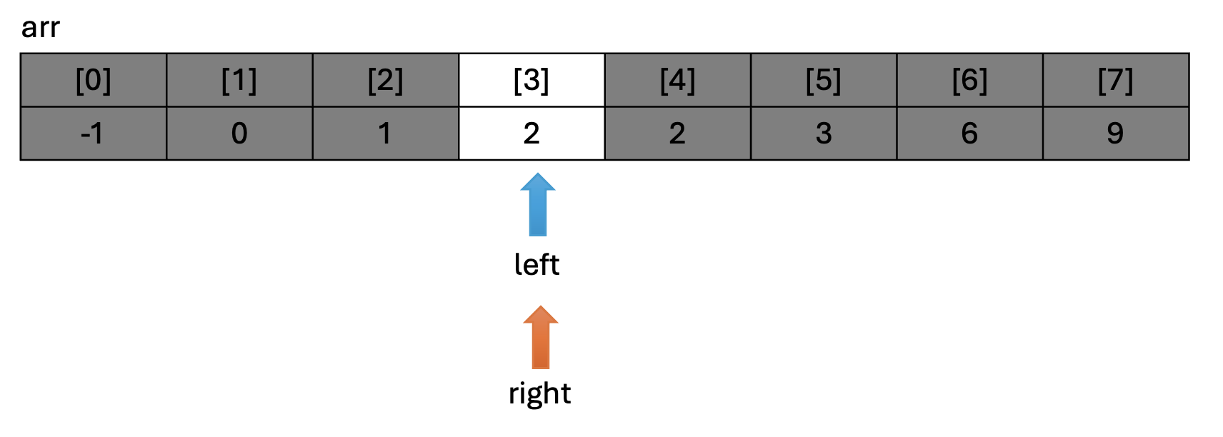 여기서 arr은 [-1, 0, 1, 2, 2, 3, 6, 9]라고 가정해본다. target은 2라고 해보자.