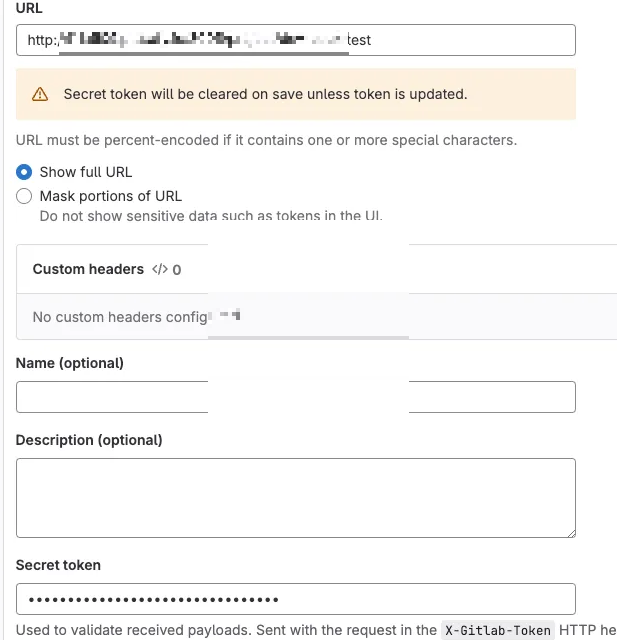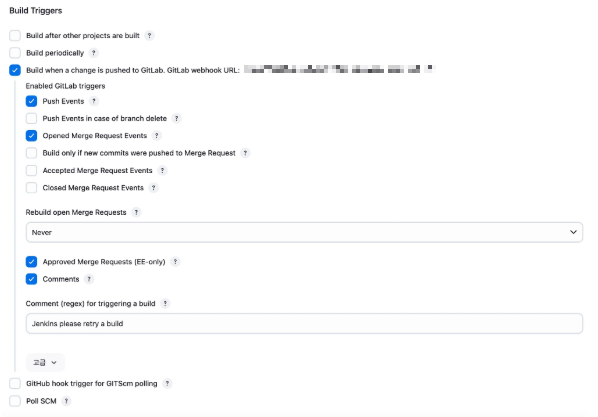 또 윗쪽에 모자이크 된 부분인 GitLab webhook URL 또한 뒤쪽에서 할 깃랩 설정에서 사용된다,